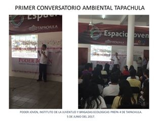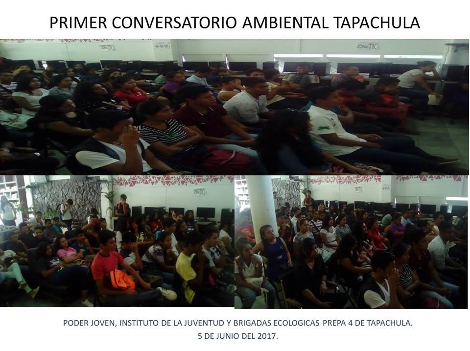 ORGANIZE EL PRIMER CONVERSATORIO AMBIENTAL EN TAPACHULA CON LA PARTICIPACIÓN DE UNIVERSIDADES, AUTORIDADES LOCALES Y JOVENES AMBIENTALISTAS INDEPENDIENTES SE TUVO LA PRESENCIA DE MAS DE CIEN ASISTENTES. LOS TEMAS ABORDADOS FUERON: CONCIENTIZACIÓN AMBIENTAL UNIVERSITARIA, LIMPIEZA RIO TEXCUYUAPAN 2017 Y SU SERVIDOR ¿QUE SON LAS BRIGADAS ECOLOGICAS PREPA 4?. HUBO UN MOMENTO DE PREGUNTAS Y RESPUESTAS, ASI COMO PRO Y CONTRAS DE CADA PROYECTO.